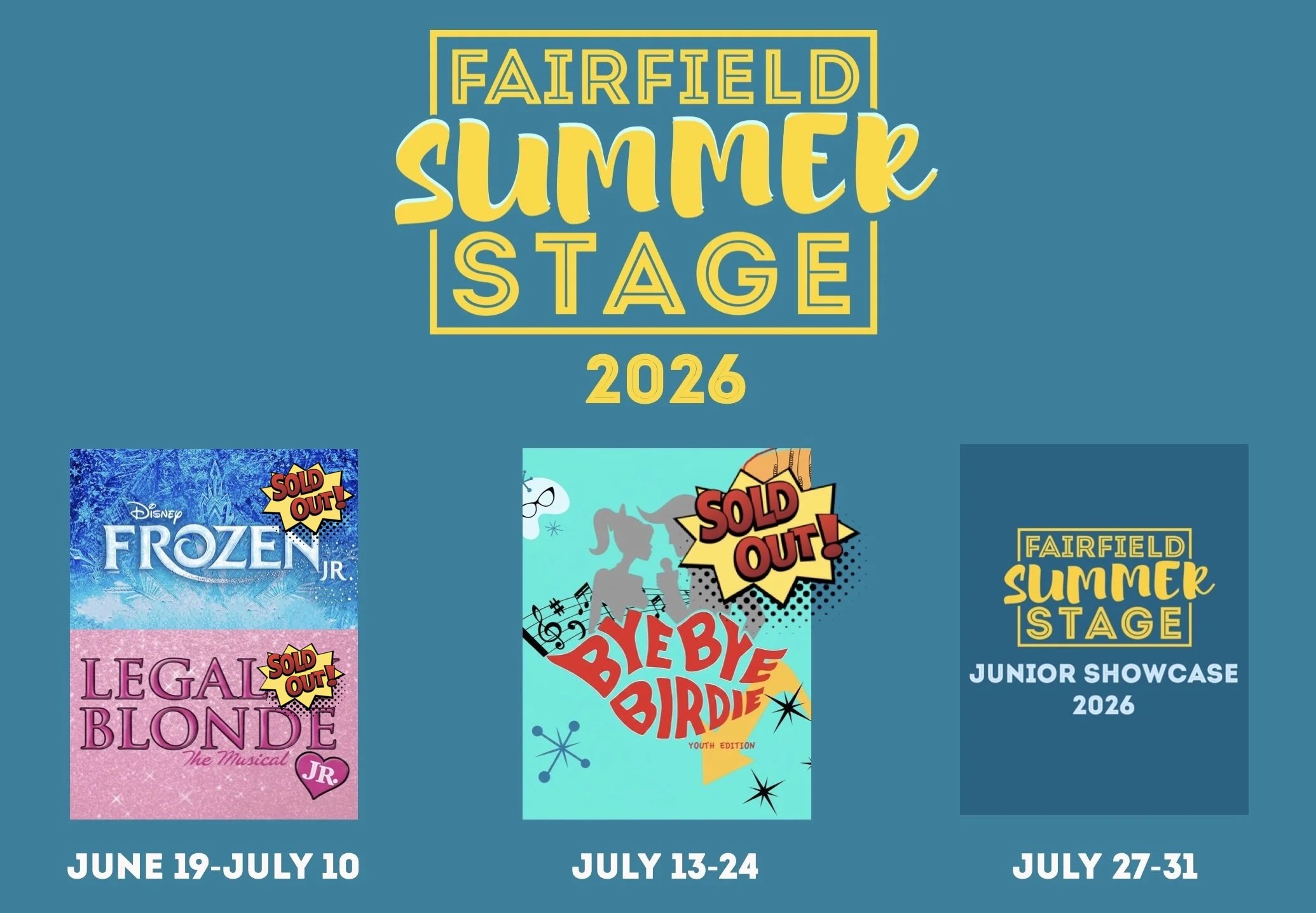 SESSION 3: Summer Stage Junior Showcase:(STILL OPEN) Join us for this special ONE WEEK session, July 27-31, 10am-1pm. Fairfield Summer Stage Jr. Showcase will culminate in a performance on stage, open to friends and family. Together, we will design a simple show featuring Broadway songs and scenes chosen by the kids themselves, and put on a show that will feature every participant in whatever way they feel comfortable (singing solo, acting in a scene, dancing, or just singing together with their friends!)